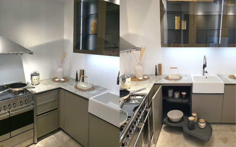 Grâce à des tiroirs coulissants ou des étagères pivotantes, les angles deviennent des zones accessibles et fonctionnelles.
