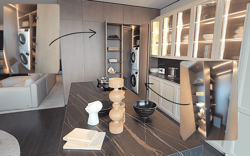 Chez SHOWROOM AVENUE, nous concevons des rangements et des portes intégrées capables de cacher une buanderie, un électroménager ou un plan de travail.